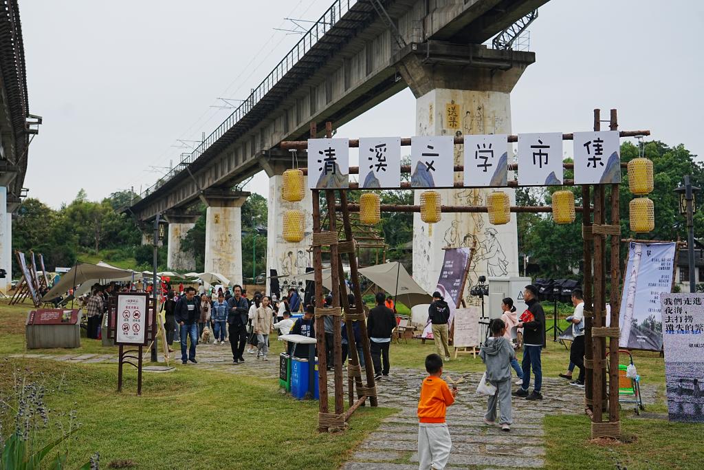在清溪村铁路桥下方的草坪上,设置了一场乡村文学市集。16个五彩斑斓的市集摊位上,从国潮文创到油纸伞,从非遗美食到中药茶饮,品类琳琅满目。周围还设置有露营区域,游客吹风小坐,品尝美食休憩,观看乡村音乐表演,生活节奏放松舒缓。